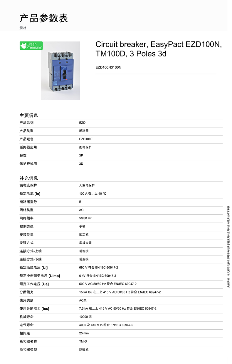 施耐德塑殼斷路器EZD系列配電用固定式斷路器EZD100N3100N產品參數表2
