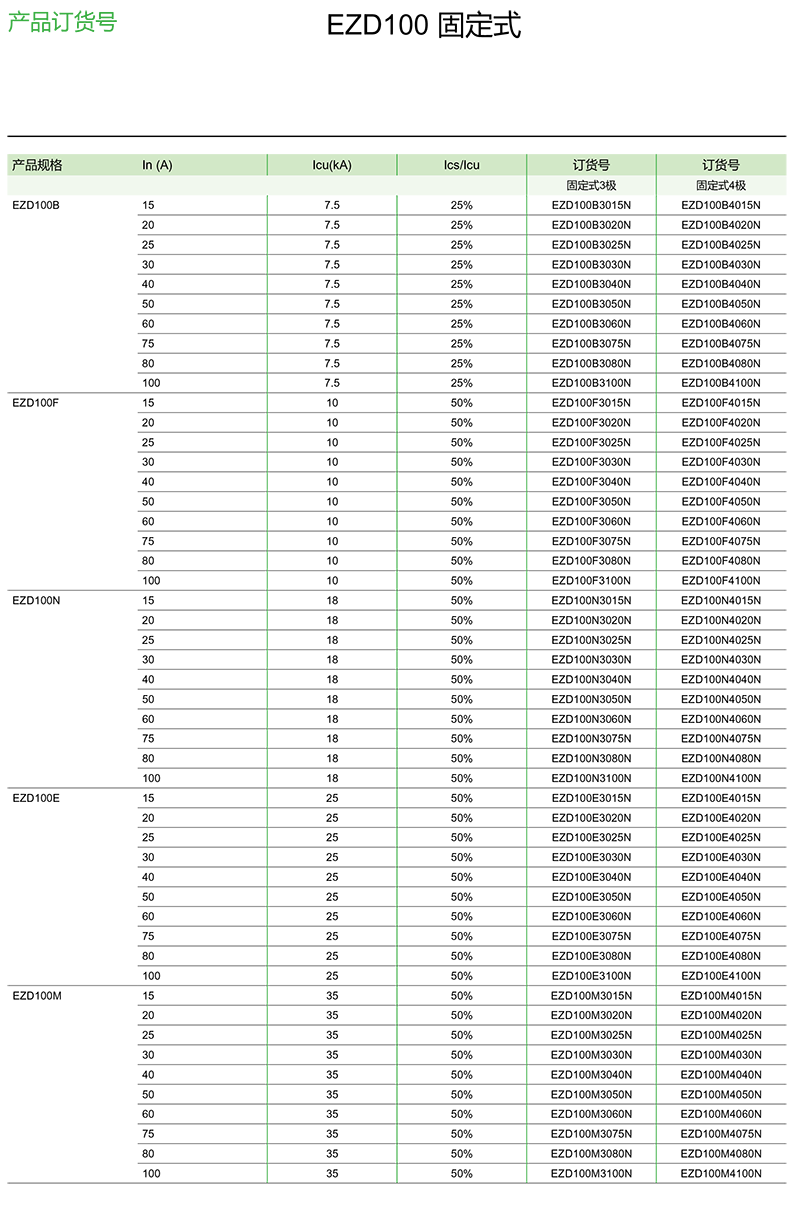 施耐德塑殼斷路器EZD系列配電用固定式斷路器EZD100N3100N產品訂貨號